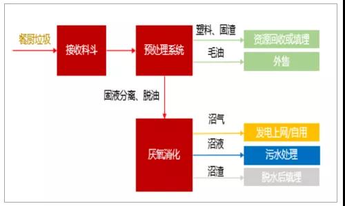 典型的餐廚垃圾厭氧消化工藝:餐廚垃圾經(jīng)過分選后,提取塑料等雜物進(jìn)行回收,漿料進(jìn)行進(jìn)一步的固液分離并提油,毛油外售,脫油后的料液全部進(jìn)入?yún)捬醢l(fā)酵罐進(jìn)行厭氧消化,產(chǎn)生的沼氣用于發(fā)電,沼液進(jìn)入污水處理系統(tǒng),沼渣則經(jīng)脫水后外運(yùn)填埋或焚燒。