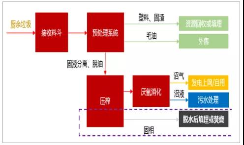 餐廚垃圾的特點(diǎn)包括有機(jī)物含量高,含水率高,易腐爛變質(zhì),易發(fā)酵、發(fā)臭,主要是采用厭氧消化、好氧堆肥和飼料化工藝等生物法進(jìn)行處理。其中厭氧消化工藝能最大化回收油脂,無害化程度高,并能夠充分地對餐廚垃圾中的有機(jī)物進(jìn)行資源化回收和利用,已經(jīng)有超過70%的餐廚垃圾處理項(xiàng)目使用這條技術(shù)路線,是現(xiàn)階段的主流工藝路線。