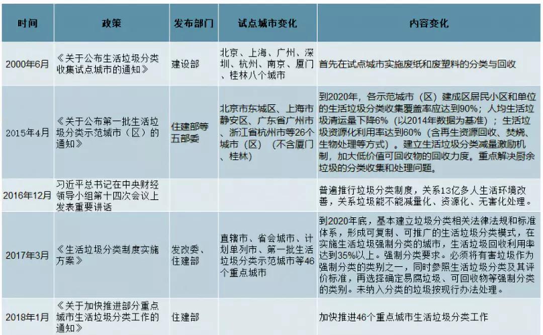 垃圾分類政策開啟廚余垃圾處理市場。2000年,北京、上海等8個(gè)城市被列為生活垃圾分類試點(diǎn)城市;2015年,26個(gè)城市(區(qū))被列為“全國第一批生活垃圾分類示范城市(區(qū))”;2017年,發(fā)改委住建部發(fā)布《生活垃圾分類制度實(shí)施方案》,要求在全國46個(gè)城市先行實(shí)施生活垃圾強(qiáng)制分類;2019年,《關(guān)于在全國地級(jí)及以上城市全面開展生活垃圾分類工作的通知》明確提出“有害垃圾、干垃圾、濕垃圾和可回收物”的生活垃圾4分類法則,并將分類范圍從原先的46個(gè)試點(diǎn)城市推廣至293個(gè)地級(jí)城市。目標(biāo)明確為,到2025年全國地級(jí)及以上城市基本建成生活垃圾分類處理系統(tǒng)。而2017年293個(gè)地級(jí)及以上城市垃圾清運(yùn)量為1.76億噸,是之前46個(gè)試點(diǎn)城市垃圾清運(yùn)量的1.85倍。