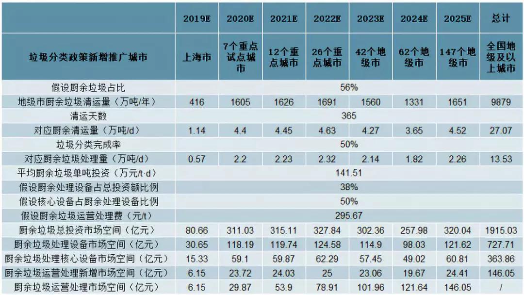 以100個(gè)餐廚垃圾試點(diǎn)城市的平均餐廚垃圾項(xiàng)目單噸投資額76.6萬元/t,處理費(fèi)197元/t作為合理估計(jì)值,可得上海環(huán)境松江、上海環(huán)境嘉定、海峽環(huán)保福州、首創(chuàng)環(huán)保寧波(一期)4個(gè)項(xiàng)目的平均廚余垃圾單噸投資額為141.5(萬元/t)。考慮到廚余垃圾的綜合處理費(fèi)較高,假設(shè)廚余垃圾處理費(fèi)是餐廚垃圾的1.5倍為295.7(元//t•d),以地級(jí)及以上城市平均每天產(chǎn)生約27萬噸廚余垃圾測算,在中性情景下(即垃圾分類完成率為50%),廚余垃圾總投資額市場空間為1915億;按廚余垃圾處理設(shè)備占總投資額的38%,核心設(shè)備占廚余處理設(shè)備的50%計(jì)算,對應(yīng)市場空間為364億;2025年廚余垃圾運(yùn)營處理市場的空間預(yù)計(jì)可達(dá)146億元,市場空間廣闊。
