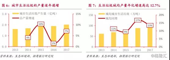生活垃圾方面,2017年全國2017 年全年我國202個大、中城市生活垃圾產(chǎn)生量為2.02億噸,同比增長7.1%;城市平均產(chǎn)量約為100萬噸,同比增長13%,近5年來城市平均生活垃圾產(chǎn)量的增速已高達(dá)12.7%,相關(guān)市場人士預(yù)計2018至2020年我國城鎮(zhèn)生活垃圾產(chǎn)量分別可達(dá)到4.1億噸、4.6億噸、5.2億噸,倘若將鄉(xiāng)村生活垃圾合并考慮,2018年至2020年我國生活垃圾總產(chǎn)量分別達(dá)到4.8億噸、5.4億噸、6.1億噸。