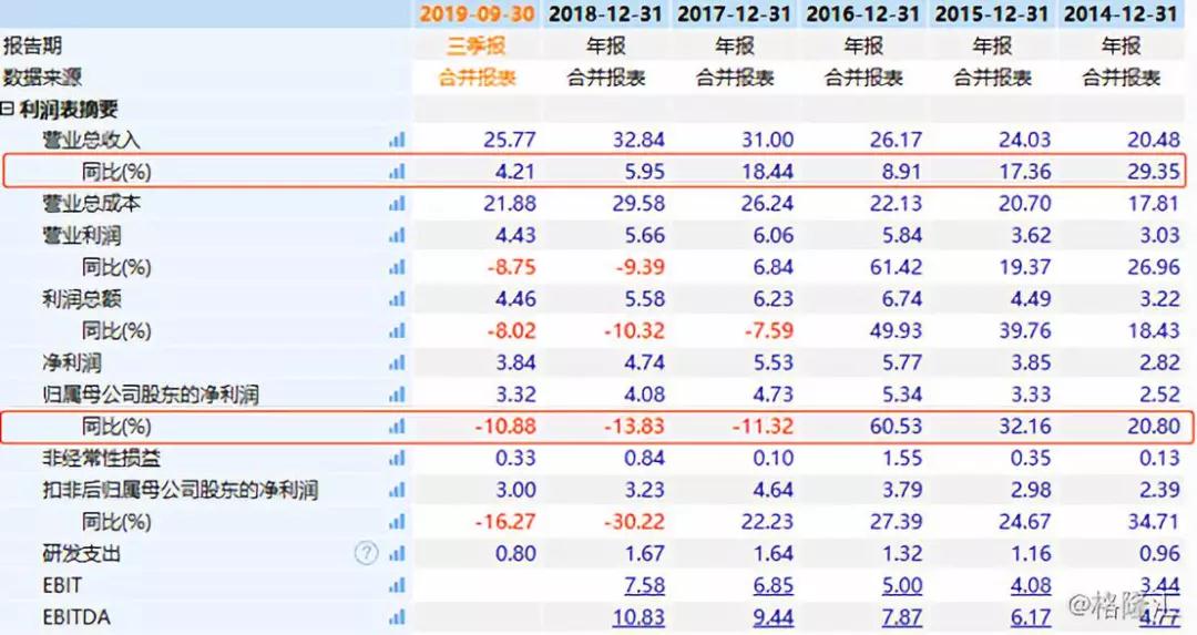 根據(jù)財報披露,2019年前三季度公司實現(xiàn)營業(yè)收入25.77億元,同比增長4.21%,歸母凈利潤3.32億元,同比下降10.88%,值得一提的是,公司近三年的凈利潤增速一直處于下滑的狀態(tài)。