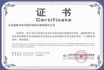 榮獲“中關村示范區(qū)信用一星級企業(yè)證書”