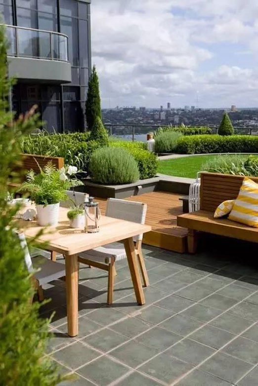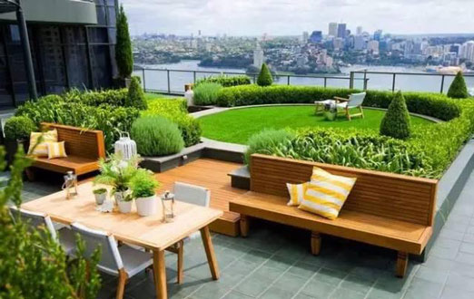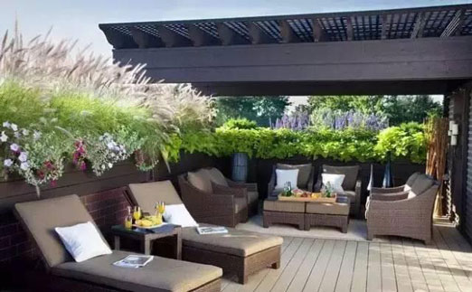 隨著人們生活條件的日益提高,多層階梯式公寓和別墅的出現(xiàn),使屋頂花園逐漸走入了人們的家庭生活。該類型的屋頂花園建于自家天臺(tái)或露臺(tái)上,是家人的朋友享用的私人空間,通常面積與荷載較小、布置精美、生活化,即可作為休閑場(chǎng)所,也可作為晾衣養(yǎng)花的功能性場(chǎng)所。